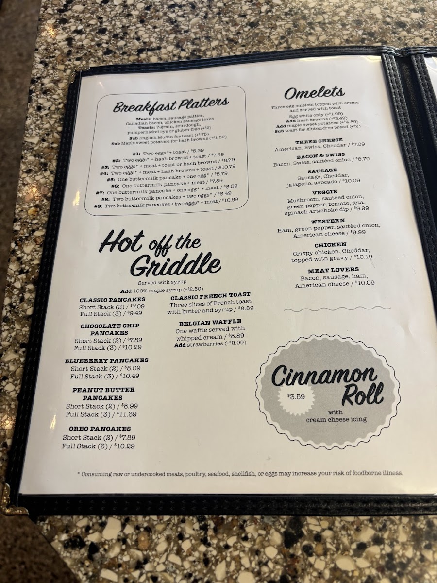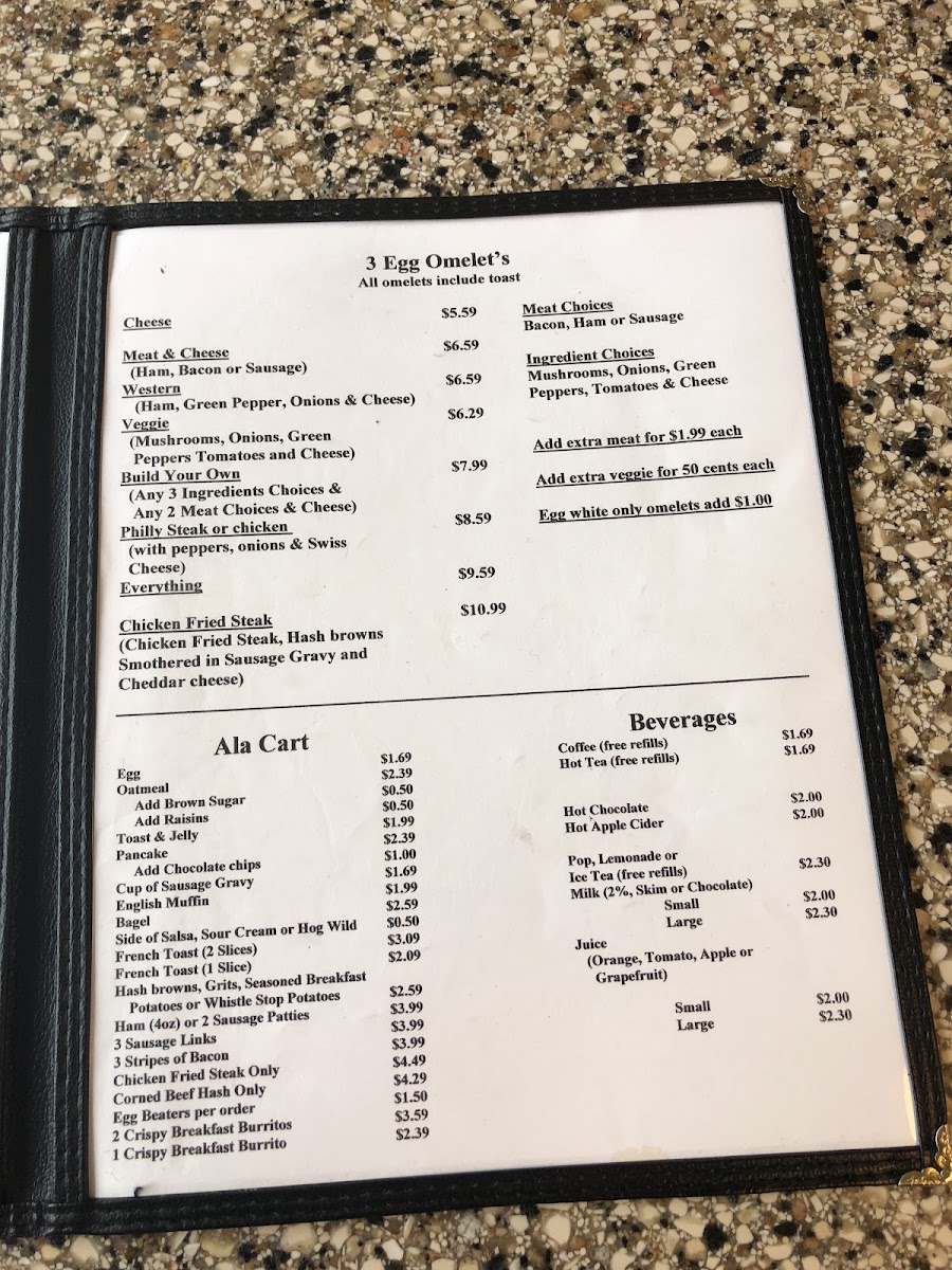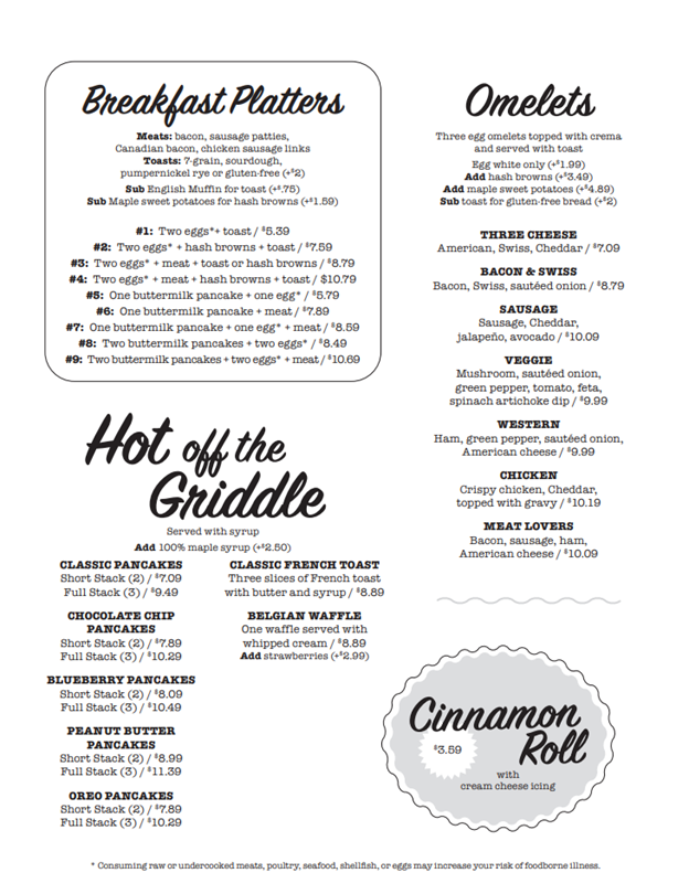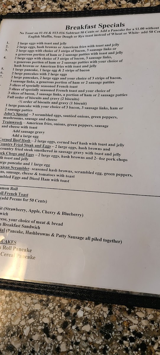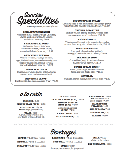 Trainwreck – American fries, onions, green peppers, sausage, and cheese with toast. Add sausage gravy for $1.99, Add a large egg for $1.99